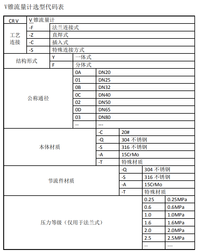 例:CR V-F Y 04 -C -Q 1.6 : V錐流量計,一體式法蘭連接,公稱通徑為DN100,本體材質為20#,節流件材質為304,壓力等級 1.6MPa。