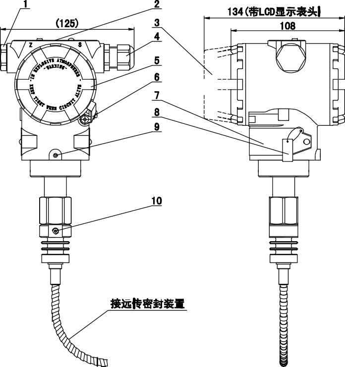 1. 電氣密封悶頭 2. 就地按鈕(蓋板下) 3. 電子部件側表蓋 4.電氣接口:M20×1.5 電纜密封頭 5. 接線端表蓋 6. 表蓋安全固定扣(防爆) 7. 銘牌 8. 懸掛式位號牌(選件) 9. 電子外殼旋轉定位鏍釘 10. 遠傳充灌密封口 |